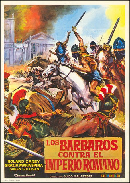 Cartel de la película Los bárbaros contra el imperio romano, producción a rebufo del éxito previsible de la película de Bronston La caída del imperio romano, que en realidad fue un fracaso de taquilla.