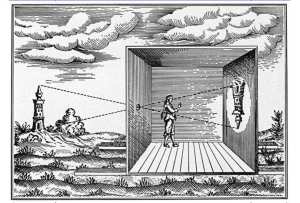 La cámara oscura o camara obscura consiste ni más ni menos que en un espacio oscuro —una habitación o un recinto creado con maderas y cortinajes— con un agujero abierto al exterior en el que se sitúa una lente de aumento. El exterior se proyecta en el interior de manera inversa, es decir, boca abajo e invertidas la izquierda y derecha también. Tal imagen ofrece claridad suficiente como para ser trasladada a un papel o un lienzo, trazando o calcando su proyección. Hockney ha hecho notar que, en algunas composiciones de pintores de los siglos XV, XVI y XVII, se dan cita algunos pequeños fallos que delatan esta técnica. A veces, vemos personajes extrañamente zurdos (se le pasó al artista prever esa contingencia al invertir la imagen) o tenemos partes de un cuadro que no se resuelven con la misma nitidez o perfección que otras.