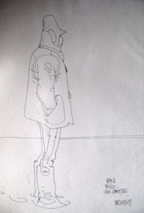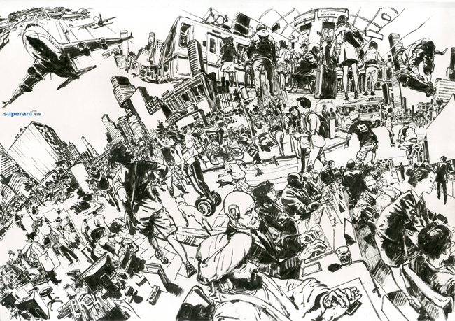 Algunos dibujantes de facilidad prodigiosa son capaces de dibujar composiciones complejas sin boceto previo. Tal era el caso del gran Jean Giraud, «Moebius» (arriba), que muchas veces prescindía de boceto, o del prodigioso Kim Jung Gi (abajo), cuya habilidad para improvisar abarrotados, extensos y barrocos dibujos con audaces perspectivas rayaba en lo sobrenatural. (Dibujo de Moebius de colección propia. Dibujo de Kim Jung Gi de https://www.academiac10.com/kim-jung-gi-o-cuando-los-problemas-tecnicos-dejan-de-ser-un-problema/ )