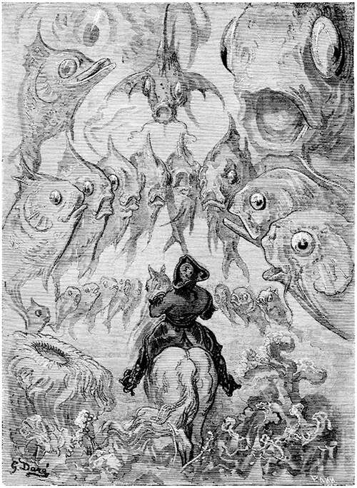 Gustave Doré. Imagen para Las aventuras del Barón Munchausen, que no nos viene mal para este Lázaro submarino salvo por el caballo y el tricornio dieciochesco.